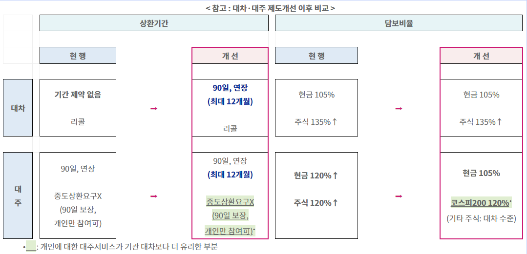 개인은 기간이 90일로 제한된 반면 외국인과 기관은 무제한으로 설정되었다는 것이 큰 차이를 만들며, 담보 비율도 외국인, 기관은 105%인 반면 개인은 120%로 쉽게 접근할 수 없게 되었습니다.