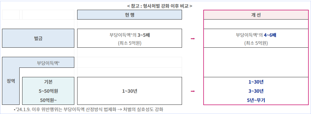 현행 3~5배의 벌금 수준에서 4~6배의 수준으로 향상과 징역형의 수준이 대폭 상향되었습니다.