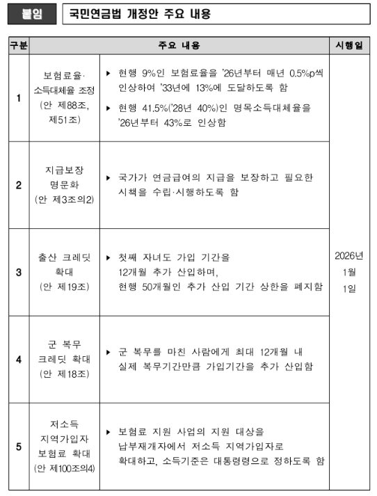위의 보건복지부 보도자료와 같이 중점적으로 바뀐 사항을 현행 9%의 보험료율을 2026~2033년까지 매년 0.5%씩 인상하여 13%의 보험료율로 전환하여 명목소득대체율을 26년 40 => 43%로 변경한다는 내용이 중점적으로 보도되었습니다.