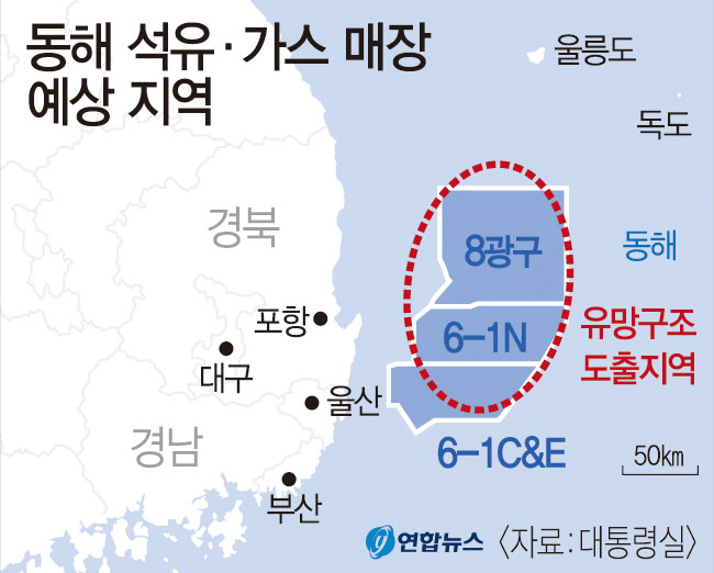 정부는 35억 배럴, 최대 140억만 배럴에 해당되는 막대한 양(최대량 시추 시 세계 매장량 순위 15위에 해당됩니다.)의 석유와 가스(국내 소비를 기준으로 하였을 경우 가스 29년 석유 4년 동안 사용 가능한 양입니다.)가 해저 8광구, 6-1광구 북부에 매장되어 있다는 물리탐사 결과가 나왔다는 발표를 하였으며, 물리탐사 기업은 엑트지오(Act-Geo)이고 한국석유공사는 국내외 업체 및 민간 전문가 위원회를 통해 신뢰성을 검증하였다고 발표하였습니다. 또한 올해 11월부터 대왕고래(프로젝트명)의 탐사 시추를 실시할 예정이며 성공 가능성은 20%으로 추정하고 있습니다.