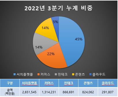 [2020년 비중 => 2021년 비중 변화 추이 = 서치 플랫폼(52.8% => 48.3%), 커머스(20.5% => 21.6%), 핀테크(12.8% => 14.4%), 클라우드(5.2% => 5.5%)]와 같이 서치 플랫폼 위주에 산업에서 다변화로 모색 중입니다.
