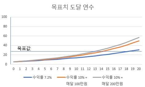 아래의 표를 참고했을 때 10% 수익률에 월 100만 원을 더 투자할 수 있다면 목표 달성 시간을 5년이라는 시간을 앞당길 수 있습니다. (7.2%=>10%로 수익이 변화할 시 4년 단축, 월 100만 원 추가 투자 시 1년 단축)
