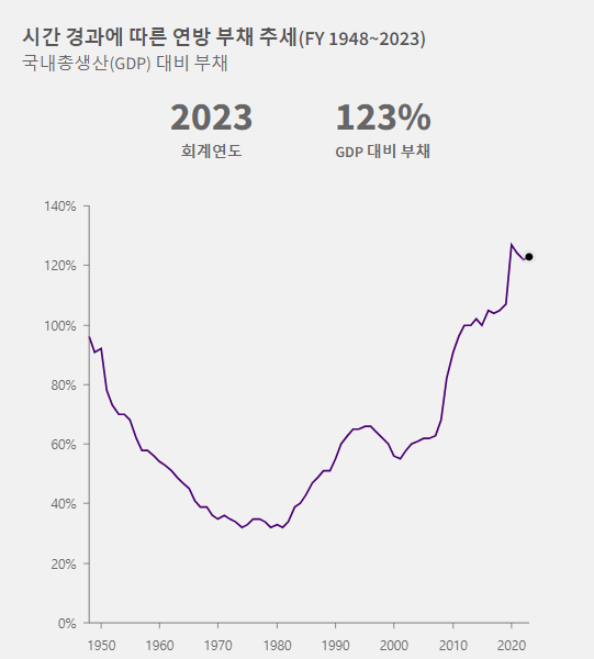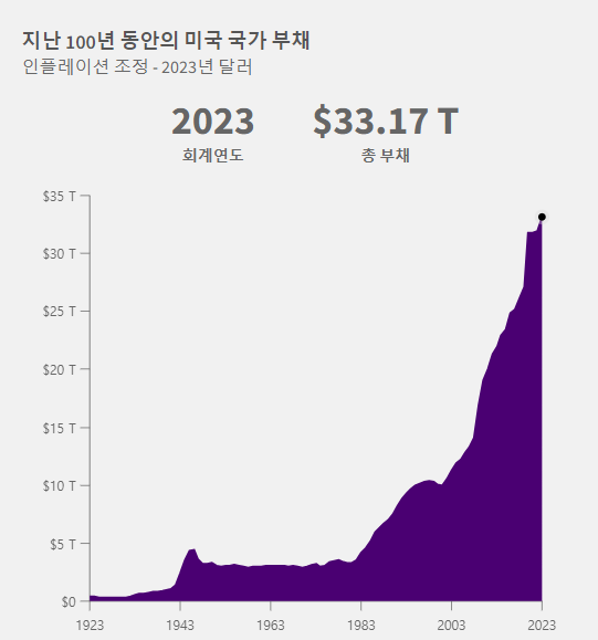 1923년 4,030억 달러에 불과했던 국가 부채가 아프가니스탄, 이라크 전쟁, 2008년 금융위기에 크게 증가하였다가 2019년 코로나19로 인하여 폭발적으로 성장하여 2023년 33.17조 달러로 경위적인 숫자를 기록하고 있습니다.