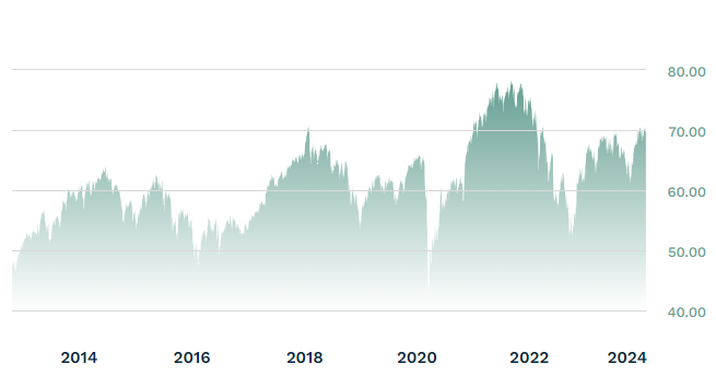 위에 같은 선발 기준으로 다양한 기업이 분포되어 있으며, ETF의 현재 주가는 $ 70.11(2024.02.10 기준), PBR(1.69), PER(13.93), 운용 수수료는 0.07% 입니다. 배당은 반기 배당(6,12월)을 실행하고 있으면, $1.94(2.76%)의 배당금을 지급하고 있습니다.