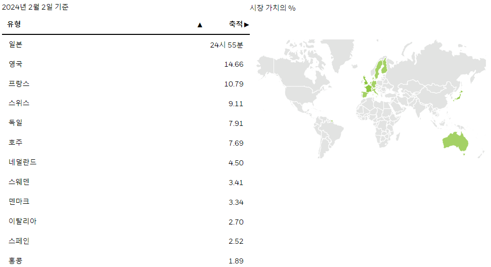 - MSCI EAFE IMI Index 지수를 추종하며 시가총액 가중 지수로 편성됩니다.