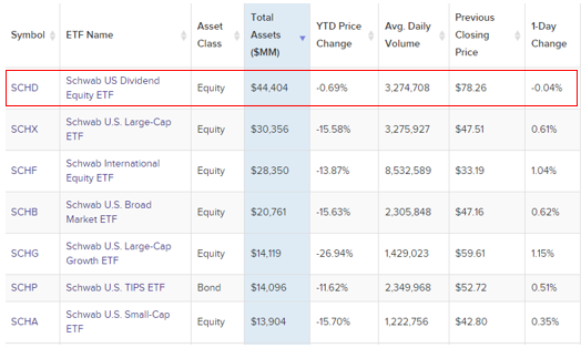 그중에서도 SCHD(Schwab US Dividend Equity ETF)는 2011년 10월에 출시하였고, Charles Schwab에서 1위의 규모를 차지하는 ETF입니다. 따라서 환금성 문제에서는 전혀 걱정할 필요가 없으며, 운영 수수료는 0.06%로 매우 적은 수수료를 추구하고 있습니다.