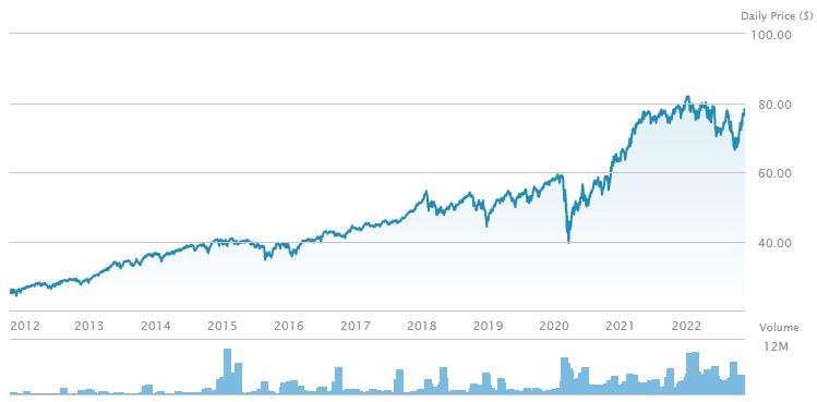 위에 같은 선발 기준으로 미국의 다양한 기업이 분포되어 있으며, ETF의 현재 주가는 $78.44(2022.11.26 기준), PBR(3.21), PER(12.37)입니다. 배당은 분기 배당(3, 6, 9, 12월)을 실행하고 있으면, $2.5468(3.25%)의 배당금을 지급하고 있습니다.