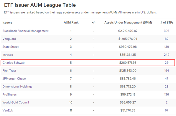 전 세계 자산운용사 순위를 보았을 때 Charles Schwab는 5위 규모로 형성되어 있습니다.