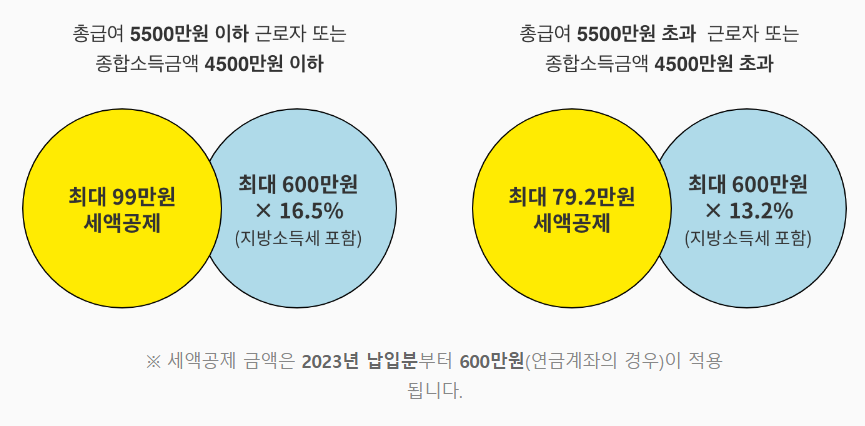소득이 5500만 원 이하 시 납입한도 600만 원 까지는 확정 16.5%로의 수익이 보장됩니다.(5500만 원 초과 시 13.2%로 축소됩니다)