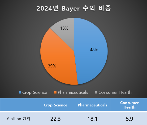 | 농업 (Crop Science) | 씨앗, 농약, 농업 솔루션 제공. 식량안보 이슈로 구조적 수요 확대. | 22.3 | 48% |
