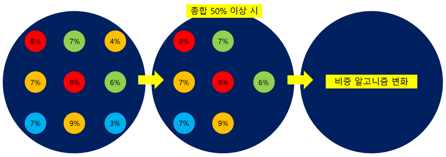 C : 선발 기업의 비중 총합이 50% 이하면 그대로 적용, 50% 이상이면 가중치 배분 알고니즘으로 조정으로 배분
