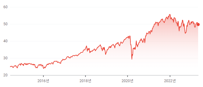 위에 같은 선발 기준으로 미국의 기업이 분포되어 있으며, ETF의 현재 주가는 $49.93(2023.05.11 기준), PBR(3.24), PER(16.03)입니다. 배당은 분기 배당(3, 6, 9, 12월)을 실행하고 있으면, $1.1922(2.41%)의 배당금을 지급하고 있습니다.
