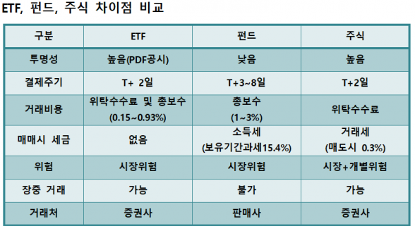 ETF(Exchanged Traded Fund)는 거래소에서 상장되어 주식처럼 사고파는것이 가능한 펀드입니다. 하지만 일반 펀드는 은행&증권회사에서 가입과 환매를 통한 거래만 가능합니다. 이러한 차이점으로 인하여 잦은 거래가 발생하였을 때 거래비용에 대한 수수료의 부문에서 막대한 차이점이 발생할 수 있습니다.