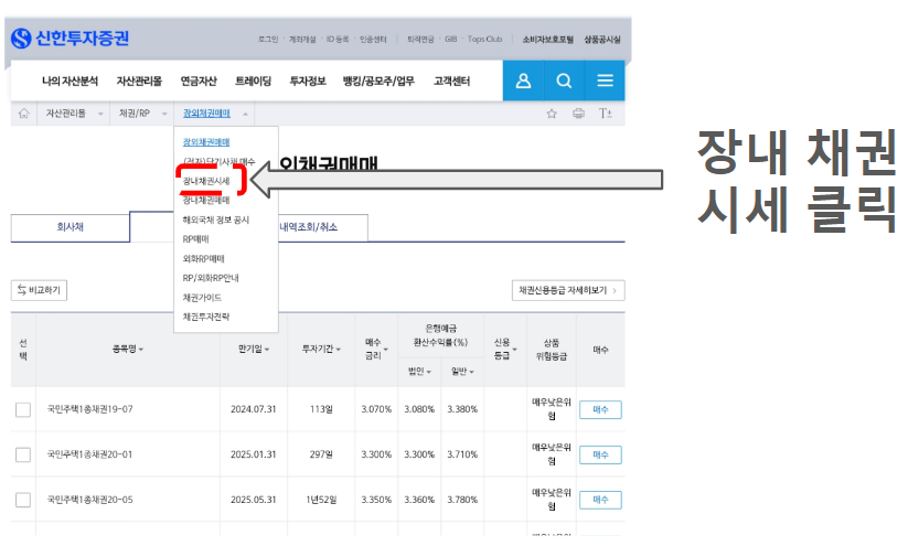 스크롤을 내려서 국공채 - 장외채권 매매를 클릭하세요
