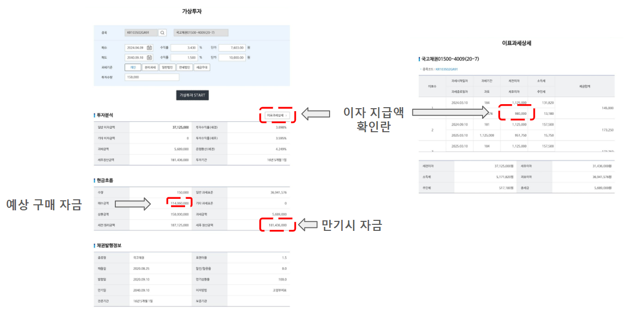 국고채 01500-4009(2024년 4월 9일 기준) 투자 수량을 150,000개를 설정하였을 시, 매입금은 약 1.14억(114,060,000원), 만기까지 받은 이자 0.37억(37,125,000)[매년 3월, 9월 951,750원 이자 지급]을 받으며 만기 시 상환액 1.5억+ 1회 이자분 받을 수 있습니다. 이는 만기 시 세후 총 금액이 1.81억 원(181,436,000원)이며, 은행환산(세전)으로 확인해 보면 4.25% 금리입니다.