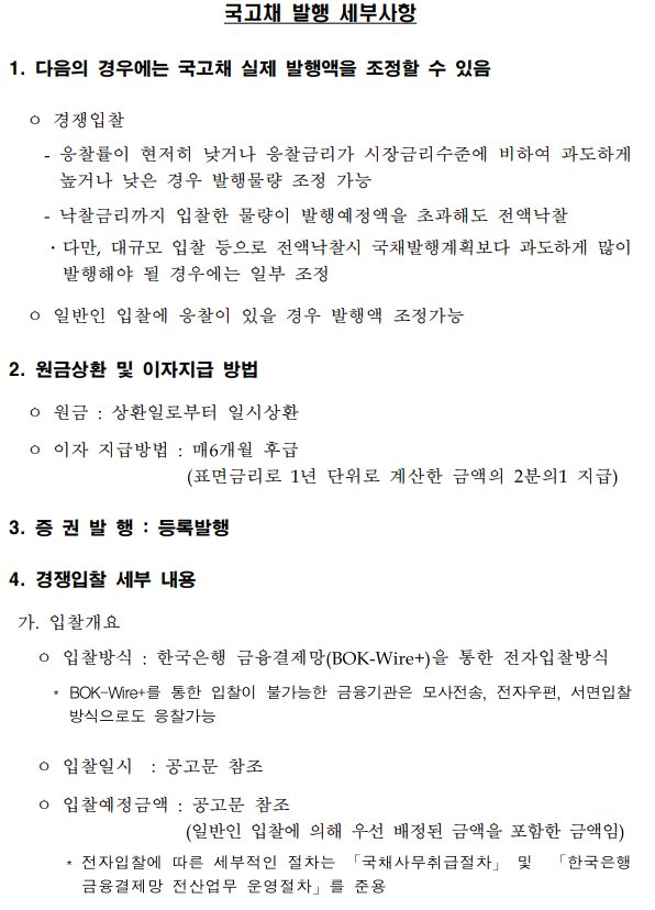 또한 발행 공고를 통해 앞으로의 이자 지급 방법과 원금 상환 방식을 표기하여 어떻게 지급되는지에 대한 내용을 확인할 수 있습니다.