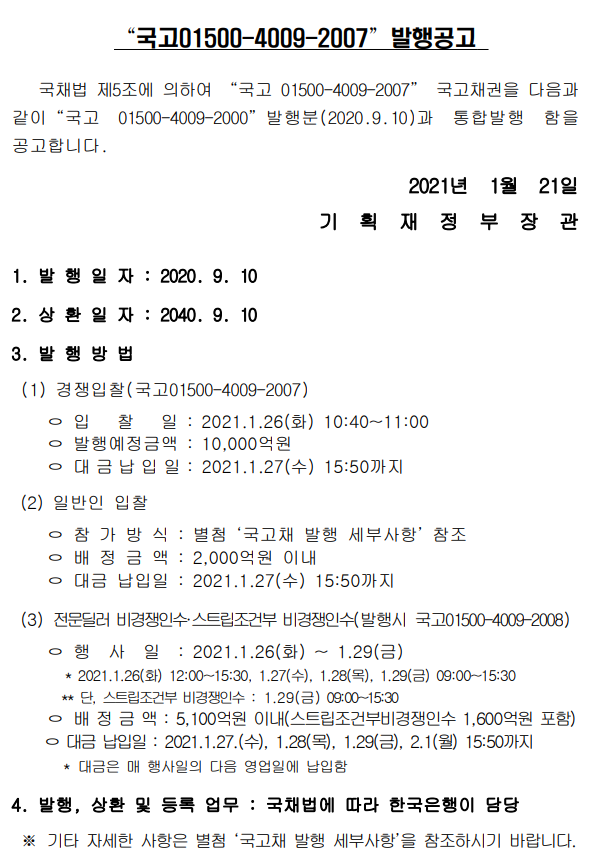 위의 번호가 앞자리 5자리는 이자율이며(01500 => 1.5%) 가운데 나와있는 숫자는 채권 만기일을 표기합니다.(4009 => 2040년 9월 만기) 마지막에 나와있는 2007은 발행번호라고 생각하시면 됩니다.