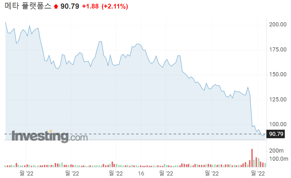 메타는 꾸준한 수익의 상승에도 불구하고 Apple의 앱 정책 변경과 같은 이슈로 인하여 주가가 계속해서 하락한 것을 볼 수 있습니다.
